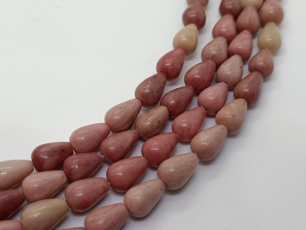Rhodoniet druppel. Rijggat is ongeveer 0.8 mm. De kraal is ongeveer 9*6 mm en in de lengte geboord.