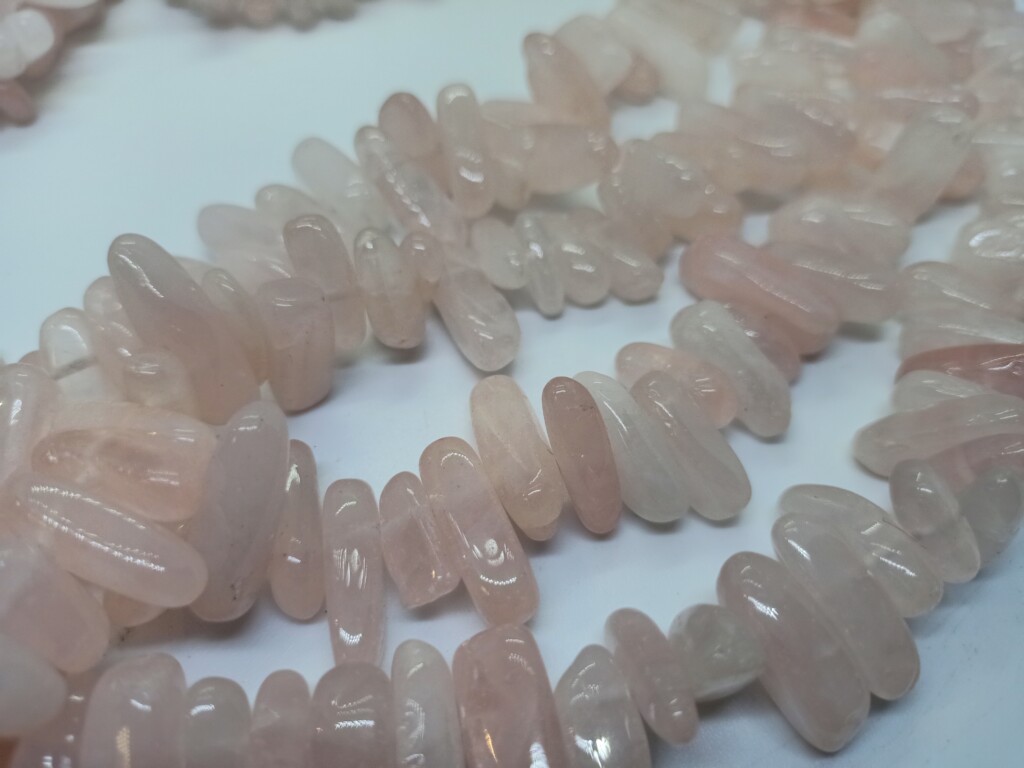 Rose kwarts punten gepolijst. rijggat is ongeveer 1 cm. Ze zijn wisselend van grootte, maar wij noemen deze strengen maat M.