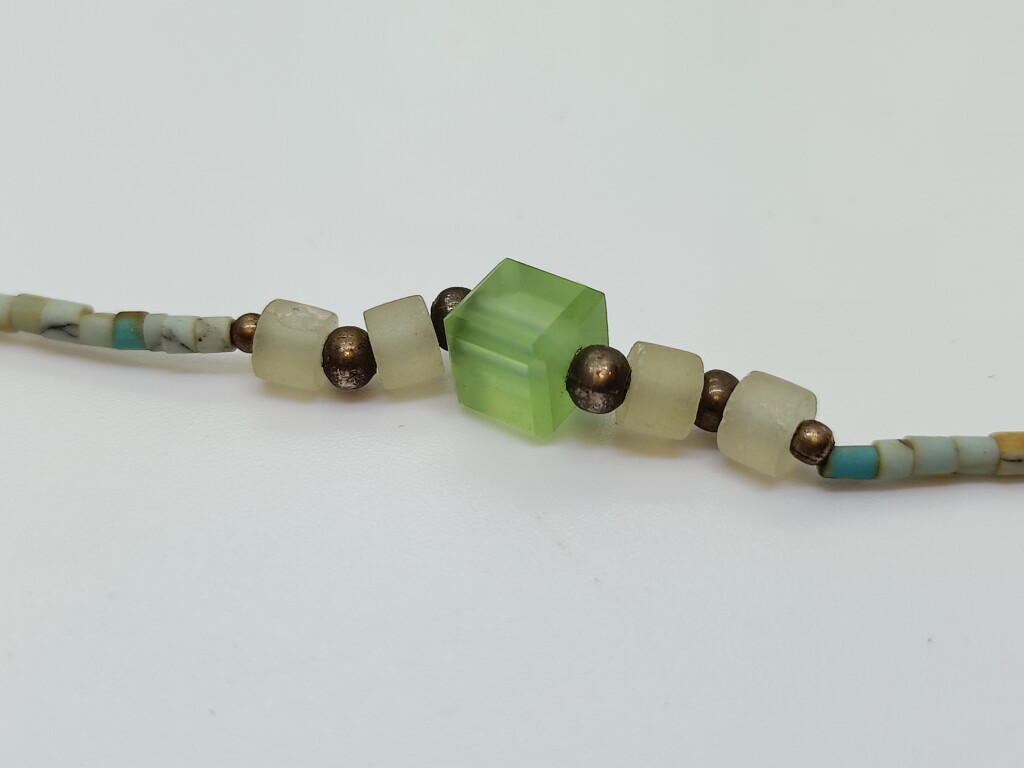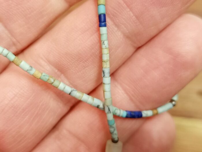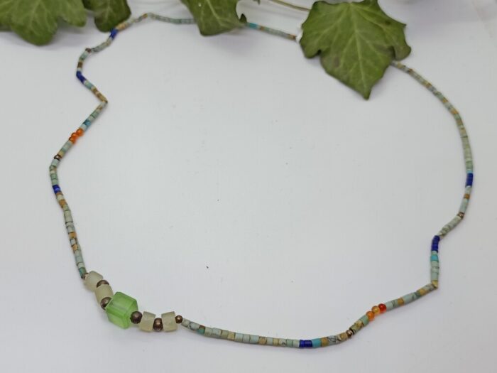 Turquoise Kettinkje van 45 cm. De kraaltjes zijn heel fijntjes en er zitten ook andere steentjes tussen.