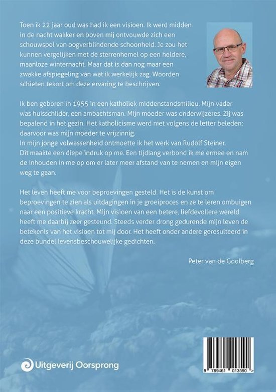 Toen ik 22 jaar oud was had ik een visioen. Ik werd midden in de nacht wakker en boven mij ontvouwde zich een schouwspel van oogverblindende schoonheid. Je zou het kunnen vergelijken met de sterrenhemel op een heldere, maanloze winternacht. Maar dat is dan nog maar een zwakke afspiegeling van wat ik werkelijk zag. Woorden schieten tekort om deze ervaring te beschrijven. Ik ben geboren in 1955 in een katholiek middenstandsmilieu. Mijn vader was huisschilder, een ambachtsman. Mijn moeder was onderwijzeres. Zij was bepalend in het gezin. Het katholicisme werd niet volgens de letter beleden; daarvoor was mijn moeder te vrijzinnig. In mijn jonge volwassenheid ontmoette ik het werk van Rudolf Steiner. Dit maakte een diepe indruk op me. Een tijdlang verbond ik me ermee en nam de inhouden in me op om er later meer afstand van te nemen en mijn eigen weg te gaan. Het leven heeft me voor beproevingen gesteld. Het is de kunst om beproevingen te zien als uitdagingen in je groeiproces en ze te leren ombuigen naar een positieve kracht. Mijn visioen van een betere, liefdevollere wereld heeft me daarbij zeer gesteund. Steeds verder drong gedurende mijn leven de betekenis van het visioen tot mij door. Het heeft onder andere geresulteerd in deze bundel levensbeschouwelijke gedichten. Peter van de Goolberg
